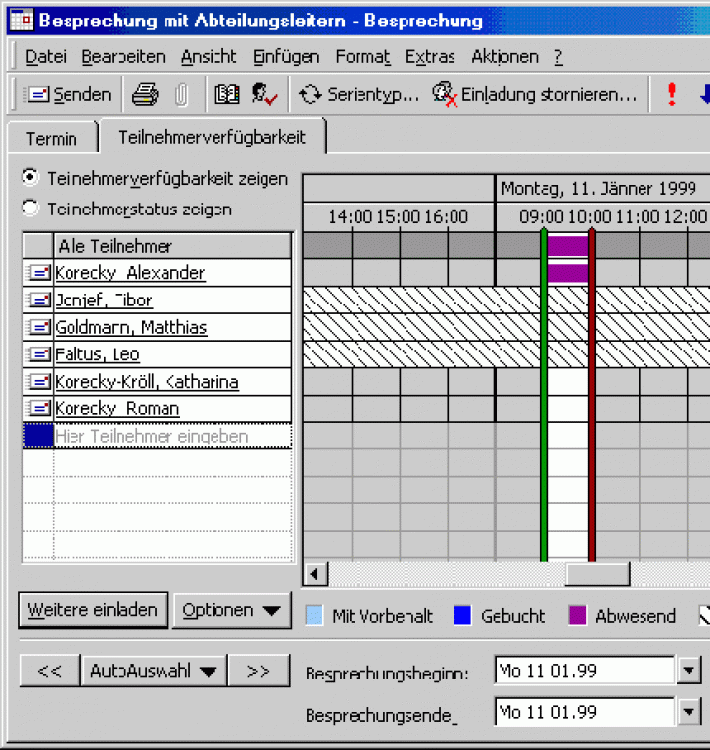 Um eine Besprechung zu planen, trägt man zunächst einen ganz normalen Termin ein. Die Zeiteinstellungen sind dabei nur vorläufig. Wichtig ist, als Beginndatum und -zeit den frühestmöglichen Termin einzugeben. Das Ende sollte so gesetzt werden, daß es die voraussichtliche Dauer der Besprechung widerspiegelt.