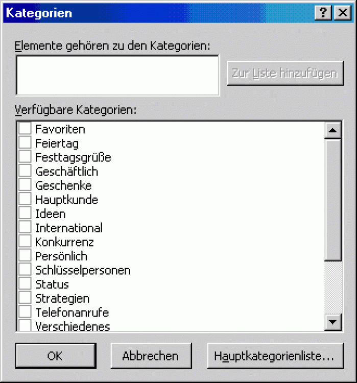 ermöglicht das Einordnen eines Termins in diverse Rubriken. Die vorhandenen Rubriken werden nach Betätigen der Schaltfläche "Kategorien..." angezeigt. In der dort aufrufbaren "Hauptkategorienliste..." können neue Kategorien angelegt werden. Zweck von Kategorien ist das spätere Filtern, Gruppieren etc. von Terminen. Dies erfolgt am besten mit Ansichten (siehe dazu Modul 4: Informationen suchen und organisieren). |