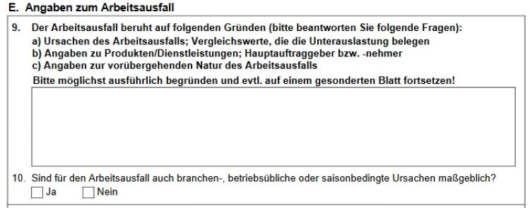 Beim Punkt 10 sollte in der Regel „Nein“ angekreuzt sein, weil solche Ursachen gegen den Anspruch auf konjunkturelles Kurzarbeitergeld sprechen. (In bestimmten Fällen können aber trotzdem wirtschaftliche Gründe vorliegen, die für Kurzarbeit sprechen.)