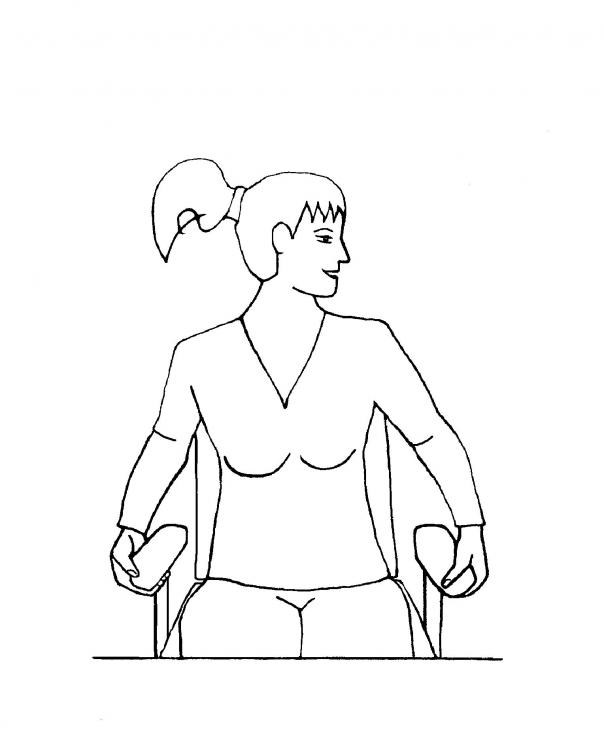 Setzen Sie sich dazu aufrecht hin. Schieben Sie Ihr Brustbein nach vorne, oben und strecken Sie Ihren Nacken lang zur Decke. Mit den Händen ziehen Sie die Armlehnen oder die Sitzfläche hoch. Einatmen - Ausatmen und den Kopf langsam zur rechten Schulter drehen, Einatmen zur Mitte, Ausatmen und den Kopf zur linken Schulter drehen. Übung dreimal zur jeden Seite ausführen.