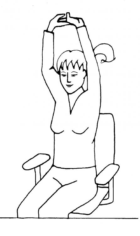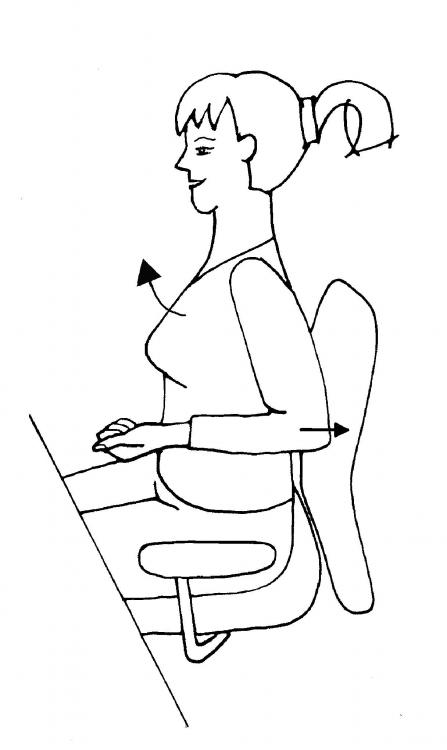 Drücken Sie dazu mit beiden Ellbogen gegen die Rückenlehne und schieben dabei den Oberkörper nach vorne oben. Ziehen Sie die Schultern weg von den Ohren und strecken Sie den Nacken lang zur Decke. Fünfmal wiederholen.