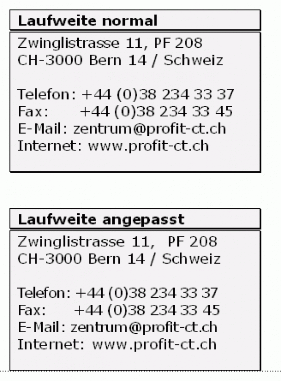 Eine leicht vergrößerte Laufweite hilft jedoch, gewisse Titel besser hervorzuheben. Und was vielleicht noch häufiger vorkommt, wenn Sie Drucksachen gestalten: Mit dem Variieren der Buchstabenabstände gelingt es Ihnen, die Darstellung einzelner Text-Bestandteile zu perfektionieren, so wie z. B. hier die Zeilenenden der Adressangaben in einem Prospekt: