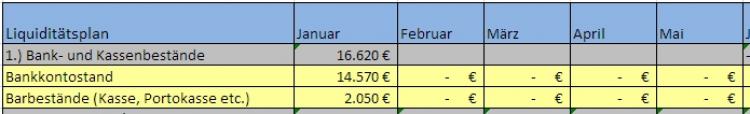 Tragen Sie die Bank- und Kassenbestände wie in der Checkliste unter Punkt 1) aufgeführt direkt im Tabellenblatt "Liquiditätsplan" ein.