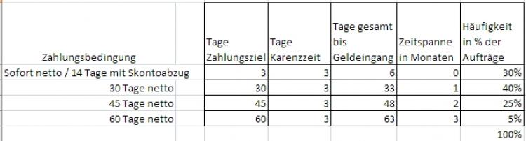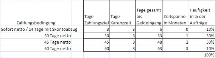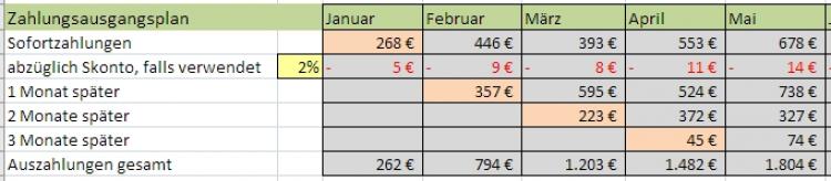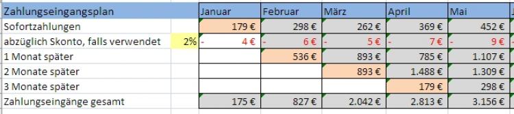 Das Beispiel zeigt in den rot markierten Zellen, wie sehr durch die verwendeten Zahlungsbedingungen der Zahlungseingang hinter dem Zeitpunkt der Rechnungsstellung im Januar nachhinkt. Nur 10 Prozent der Forderungssumme gehen noch im selben Monat ein! 30 Prozent folgen im Februar und 50 Prozent folgen im März. Das bedeutet: Bis alle Zahlungen eingegangen sind, ist es bereits April.