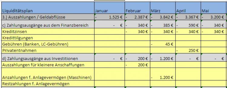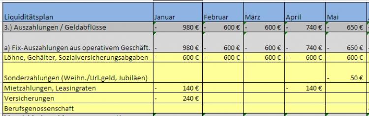Dann folgen alle regelmäßigen quartalsbezogenen oder einmaligen Zahlungen, wie Maschinenwartung, Versicherungen etc.