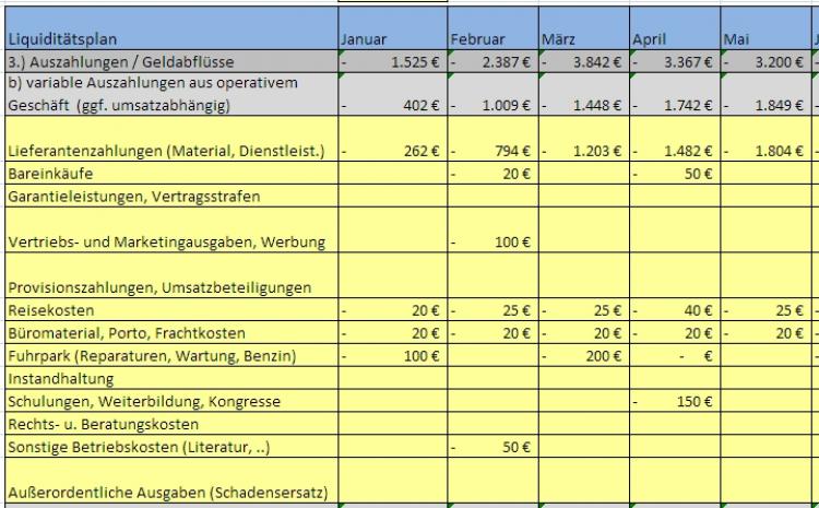 Am einfachsten ist es, systematisch vorzugehen: Zuerst werden die regelmäßigen Zahlungen für Personalkosten eingetragen. Dann folgen monatliche Zahlungen, wie Miete, PKW-Kosten usw.