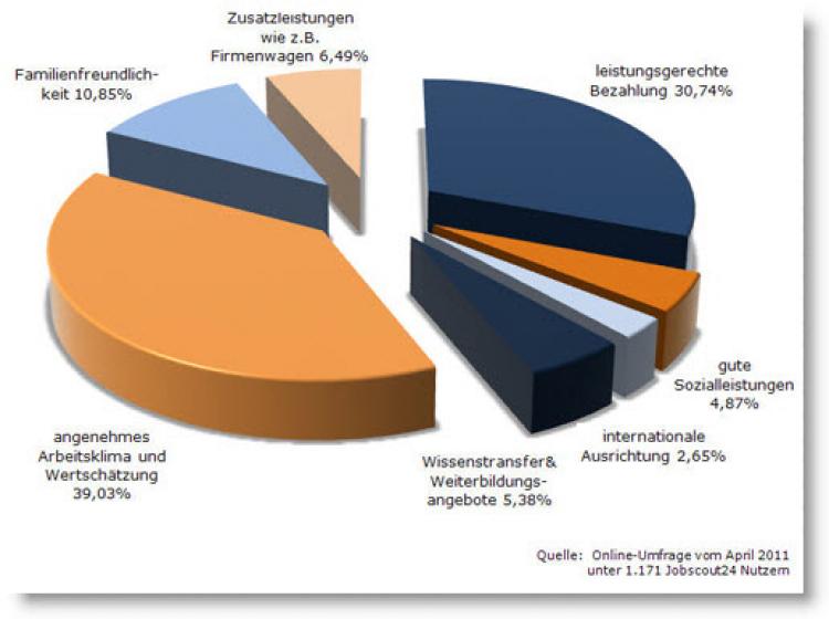 Glaubt man einer Online-Umfrage der Jobbörse Jobs.de (damals Jobscout24), dann sind "angenehmes Arbeitsklima und Wertschätzung" aus Sicht von Mitarbeitern das entscheidende Qualitätsmerkmal bei der Beurteilung eines Arbeitsplatzes wichtiger noch als die leistungsgerechte Bezahlung: