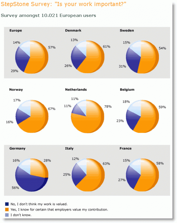 Eine Umfrage der Jobbörse Stepstone unter 10.000 Angestellten in acht europäischen Ländern brachte vor einigen Jahren zutage, dass in Deutschland "mehr als die Hälfte der Beschäftigten den Eindruck (haben), dass ihre Leistungen von ihrem Chef nicht geschätzt werden". Nur 28 Prozent wussten demnach sicher, dass ihre Arbeit honoriert wird.