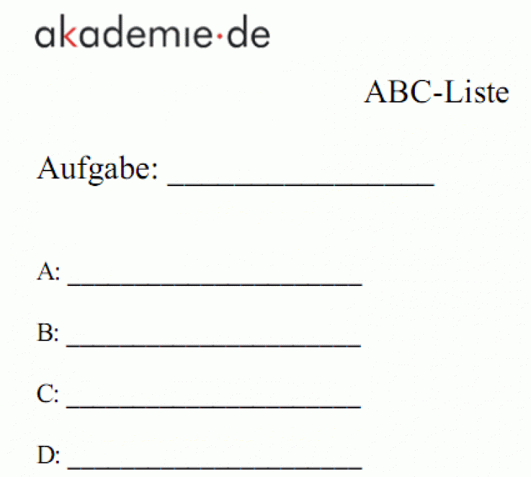 Damit Sie gleich loslegen können, haben wir eine Blanko-ABC-Liste im PDF-Format vorbereitet, die Sie herunterladen und ausdrucken können. Sie können aber natürlich genauso gut zu Stift und Papier greifen.