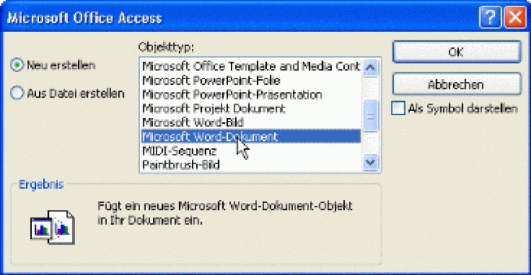 Um ungebundene Objekte einzufügen, wird nach der Wahl des Tools Objektfeld das künftige Feld aufgezogen. Das Objekt kann in der Folge neu erstellt werden - in der Liste Objekttyp ist die entsprechende Option auszuwählen. Um auf ein bereits bestehendes Objekt zuzugreifen, ist nach der Option Um auf ein bereits bestehendes Objekt zuzugreifen, ist nach der Option Aus Datei erstellen die Schaltfläche Durchsuchen... anzuwählen. Das so eingebundene Objekt lässt sich über die entsprechende Option mit der Originaldatei verknüpfen.