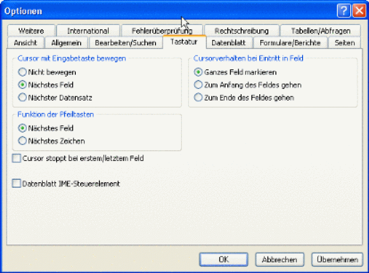 Das Standardverhalten von EINGABE und PFEIL-Tasten kann in den Optionen des Extras-Menüs auf dem Register Tastatur voreingestellt werden.
