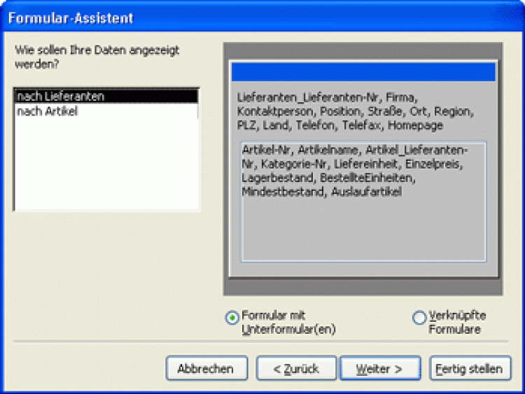 Treffen Sie eine Auswahl von Feldern aus den verschiedenen Tabellen (für diese muss eine Beziehung definiert worden sein).