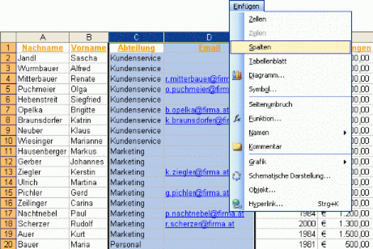 • Markieren Sie die Spalten Abteilung und E-Mail, gehen Sie anschließend auf dasd Einfügen-Menü, Unterpunkt Spalten. Geben Sie die Feldnamen ein und optimieren Sie bei Bedarf die Spaltenbreite.