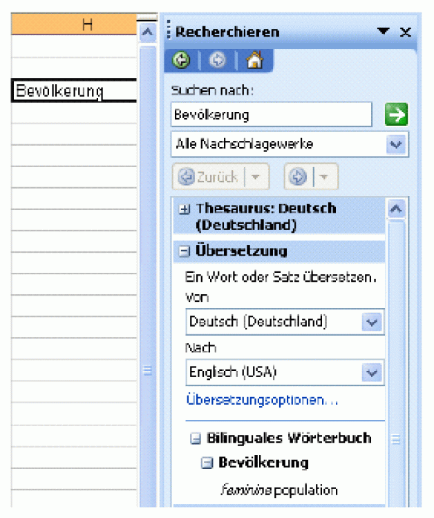 Es erscheint der Aufgabenbereich Recherchieren. Wählen Sie in diesem Aufgabenbereich in dem Listenfenster unter Suchen nach den benötigten Nachschlagedienst.