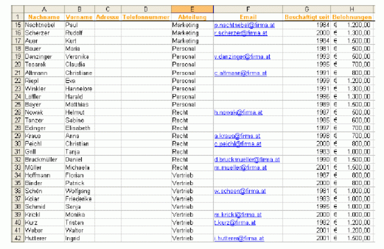 Fügen Sie zwischen den Spalten Vorname und Abteilung zwei Spalten ein, denen Sie die Bezeichnung Adresse und Telefonnummer geben.
