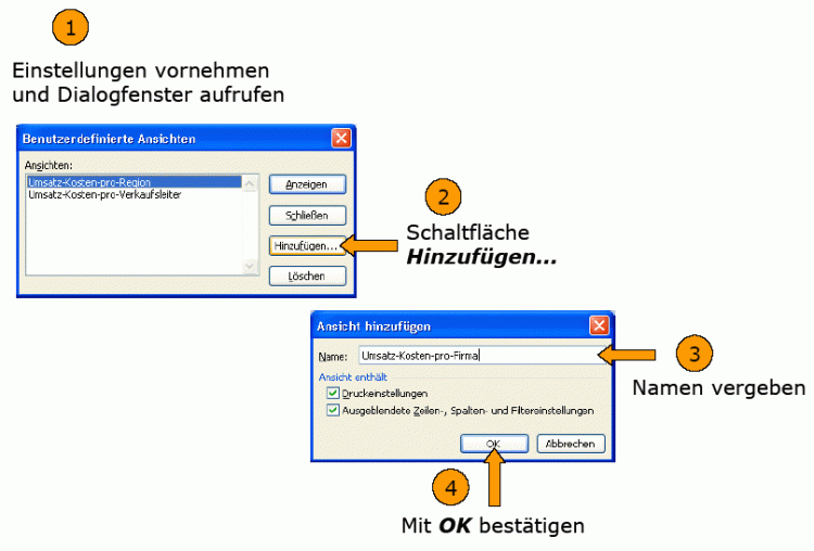 Um eine Ansicht zu definieren, ist zunächst die Tabelle mit den oben genannten Einstellungsmöglichkeiten anzupassen. In der Folge ist Benutzerdefinierte Ansichten... im Ansicht-Menü aufzurufen. Hier wird über die Schaltfläche Hinzufügen... ein Dialogfeld angezeigt, in dem der Name und die Eigenschaften der Ansicht festgelegt werden.