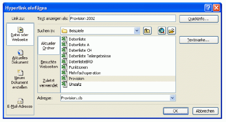 In dem folgenden Dialogfenster ist der URL bzw. Pfad zu dem aufzurufenden Dokument anzugeben. Mit den Symbolen im linken Bereich des Dialogfensters kann ein Hyperlink zu Datei oder Webseite, Aktuelles Dokument, Neues Dokument erstellen oder E-Mail Adresse eingerichtet werden.Innerhalb von Excel kann ein Kopiervorgang mit Als Hyperlink einfügen im Bearbeiten-Menü beendet werden.
