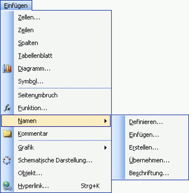 Einfügen...: Zuvor festgelegte oder übernommene Namen werden in Formeln eingefügt: statt =B2-B3 z.B.: =Erlöse_2002-Aufwände_2002.