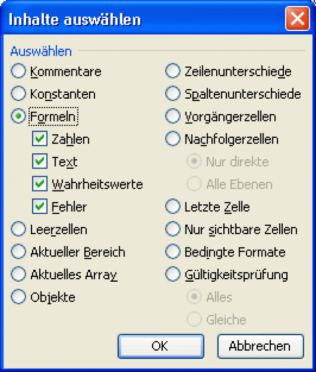 Mit Gehe zu... im Bearbeiten-Menü und der Schaltfläche Inhalte... kann eine Auswahl von Zell-Eigenschaften getroffen werden. Nach dem Bestätigen mit OK werden der Auswahl entsprechende Zellen markiert.