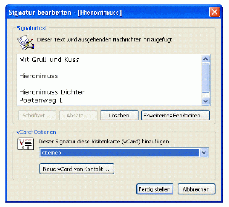 Im Dialogfenster Signatur bearbeiten kann einer Signatur auch eine VCard hinzugefügt werden. Diese muss vorher als Kontakt angelegt worden sein. Eine VCard ist eine Datei, die Empfängern ermöglicht, Adressinformationen sehr komfortabel durch z.B. Ziehen mit der Maus in VCard-kompatible Adressverwaltungen zu übernehmen (z.B. MS Outlook).