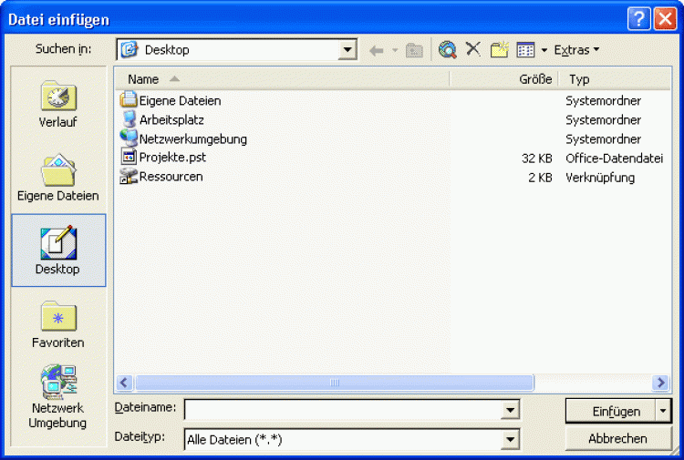 Auf dem Weg zur Dateianlage - das Dialogfenster Datei einfügen