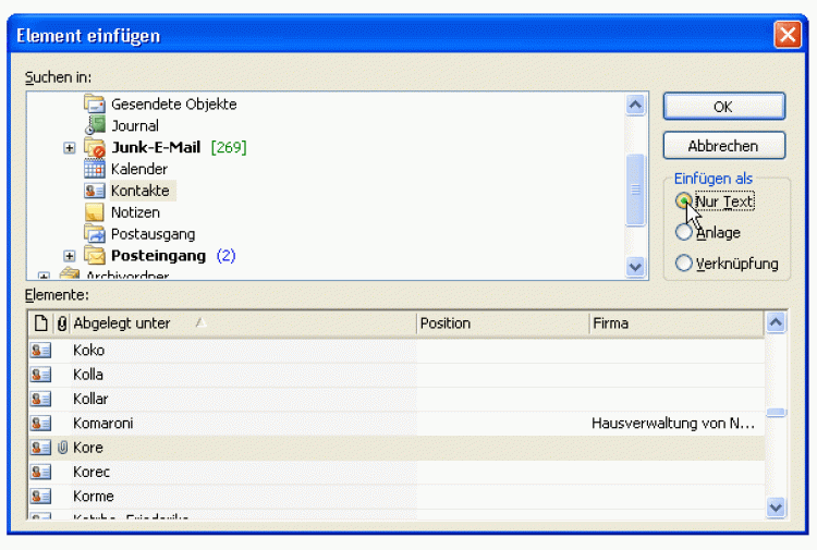 In dem folgenden Dialogfenster wählen Sie im oberen Teil den Outlook-Ordner, in dem das Element derzeit gespeichert ist und unten das gewünschte Element. Rechts können Sie im Gruppenfeld Einfügen als festlegen, ob das Element als Nur-Text oder als Anlage versendet werden soll.