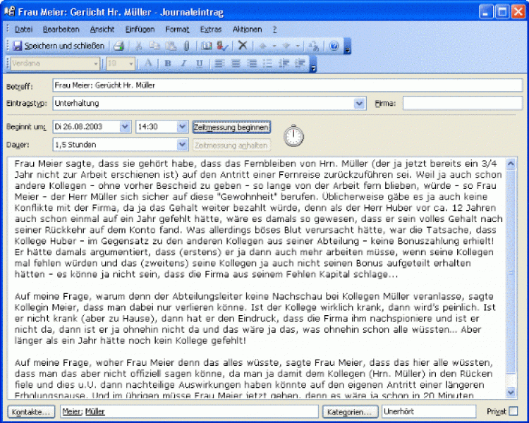 Wenn im Journal Tätigkeiten mit anderen Office-Produkten protokolliert werden, können kürzlich bearbeitete Dokumente schnell gefunden werden. Wenn das Feld Kontakte... im Dialogfenster Journaleintrag verwendet wird, können Journaleinträge als Aktivitäten einer bestimmten Person zugeordnet werden: Aufgelistet werden diese Journaleinträge dann im Dialogfenster Kontakt, im Register Aktivitäten!