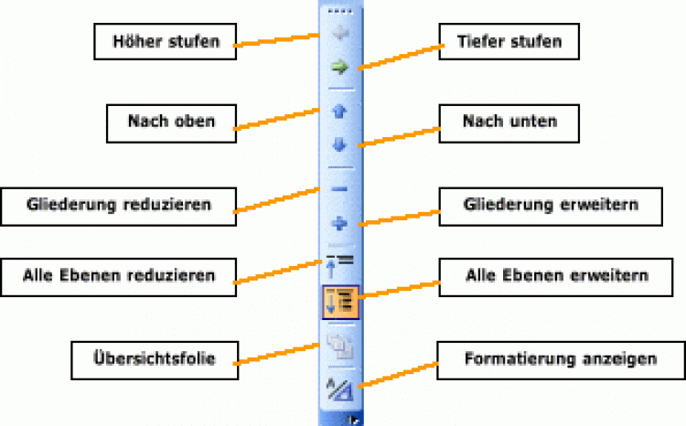 Das Höher- bzw. Tieferstufen von Absätzen und die Umstellung der Reihenfolge von Texten gelingt auch durch Markieren des dem Text vorangestellten Symbols und Ziehen mit der Maus (gilt auch im Register Folien).