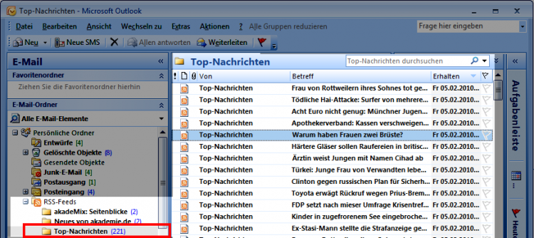 RSS-Newsfeeds sind grundsätzlich eine feine Sache. Zumal diese Kurznachrichten inzwischen ja auf vielerlei Wegen gelesen werden können, ohne dass dafür eine separate Software installiert werden muss. Unter anderem auch mit MS Outlook 2007. Wenn man jedoch Pech hat, werden dort unerwünschte RSS-Feeds angezeigt, die ständig für ungewollte Download-Aktivitäten sorgen. Vor allem die nervigen "Top-Nachrichten" von MSN ("Warum haben Frauen zwei Brüste?") tauchen vielfach ungefragt in den RSS-Abolisten auf: