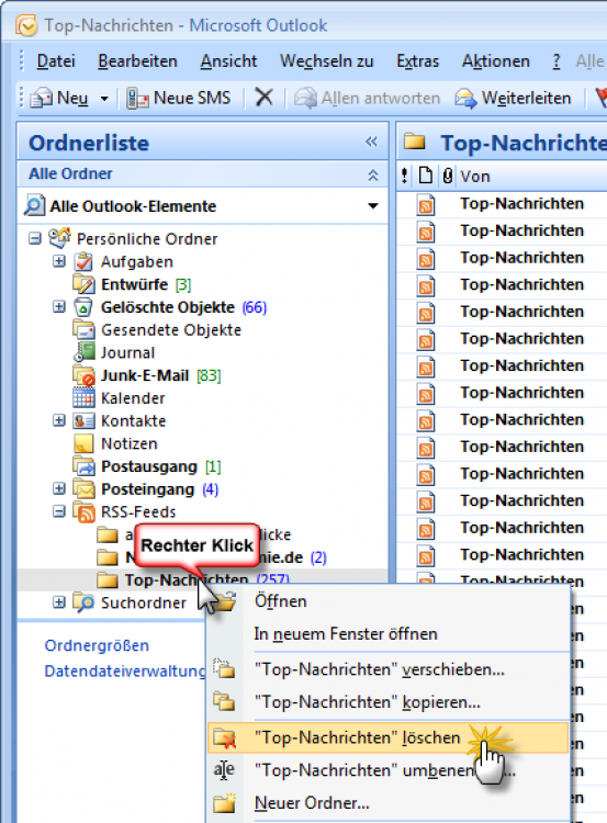 klicken auf den Ordner "Microsoft Feeds" und dort mit der rechten Maustaste auf die "Top-Nachrichten" und