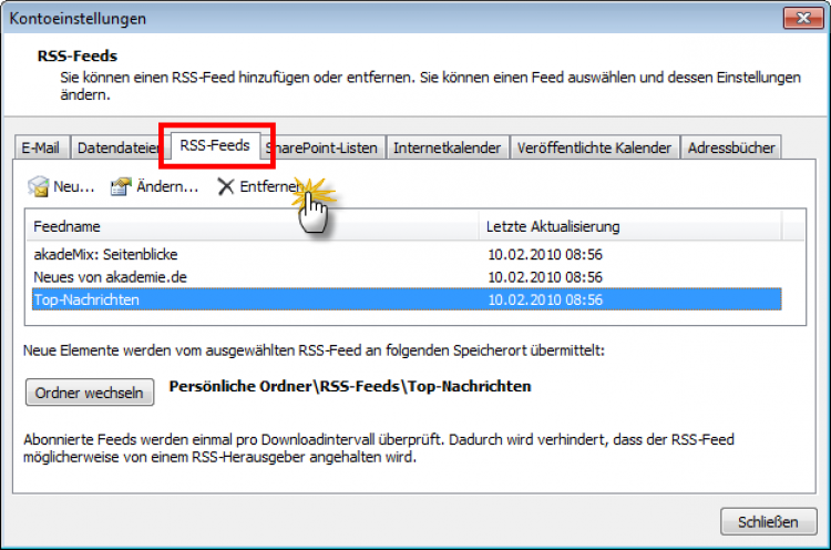 Zweiter Löschversuch: RSS-Feeds entfernen via Outlook-Kontoeinstellungen