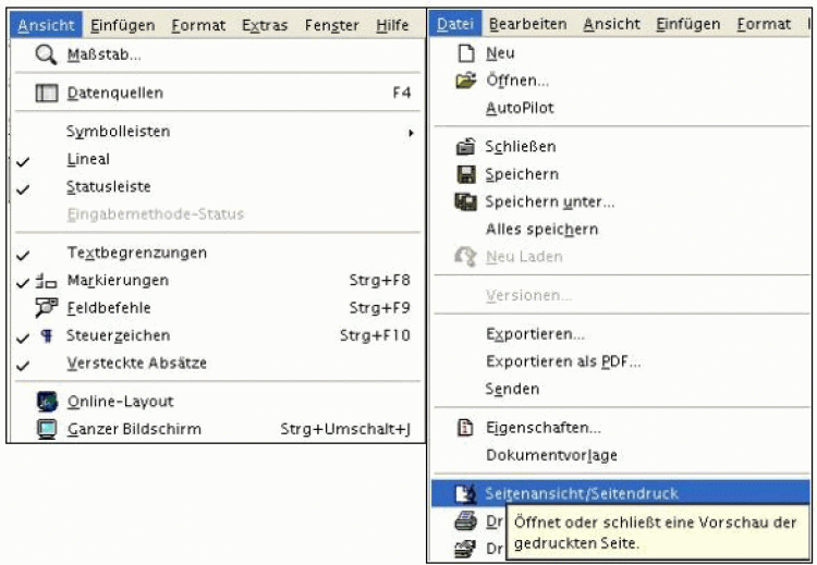 Mit Seitenansicht/Seitendruck im Datei-Menü wechseln Sie in eine Druckvorschau des Dokuments. In dieser Ansicht sind keine Formatierungen möglich, sie dient zur Kontrolle des Dokuments vor dem Ausdruck. Sie können aus dieser Ansicht das Dokument drucken oder speichern, aber nicht bearbeiten. Um in die Standardansicht zurückzukehren, klicken Sie auf die Schaltfläche Seitenansicht schließen.