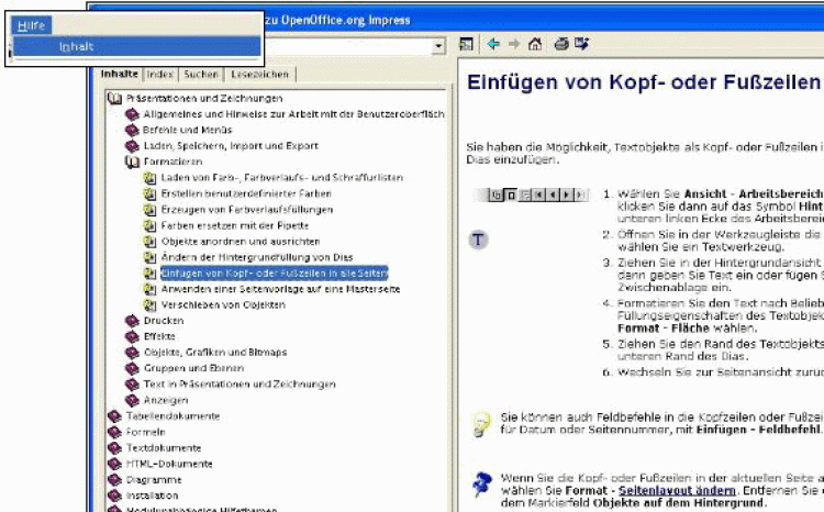 Die Hilfe-Funktion von OpenOffice.org Writer rufen Sie mit dem Hilfe-Menü und Inhalt oder durch Drücken der Funktionstaste F1 auf und öffnen damit das Fenster OpenOffice.org Hilfe.