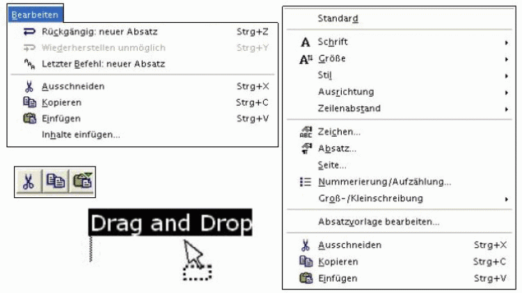 Alternativ dazu können Sie aus dem Kontextmenü der Markierung (rechte Maustaste) die Befehle Kopieren bzw. Ausschneiden (Verschieben) und Einfügen oder die entsprechenden drei Symbole in der Funktionsleiste verwenden.