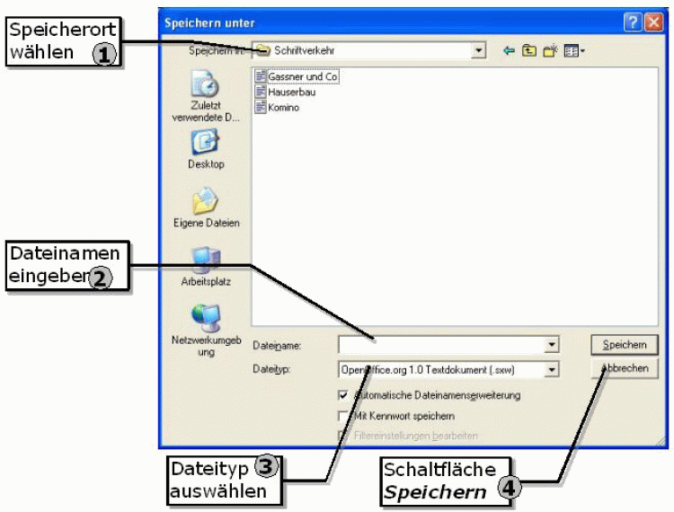 Im Listenfenster Dateityp kann u. a. auch Textdokumentvorlage (*.stw), MS Word (*.doc, verschiedene Versionen), Rich Text Format (*.rtf), Starwriter (*.sdw, verschiedene Versionen), Textformat (*.txt) oder HTML-Dokument (*.htm, *.html) angegeben werden. Das Abspeichern in anderen Dateiformaten ist mitunter dann notwendig, wenn Sie ein Dokument erhalten, das mit einem anderen Programm erstellt wurde, und Sie es wieder an den Autor zurücksenden wollen.
