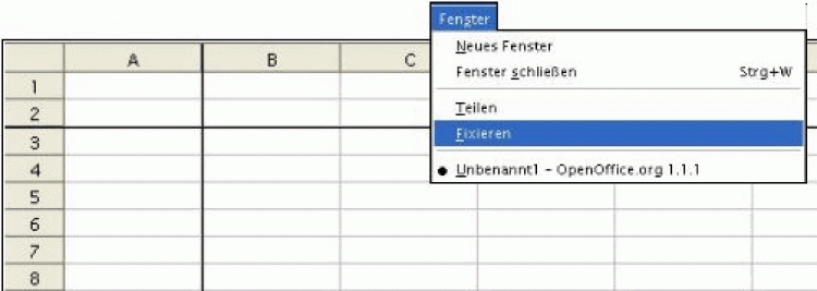 Mit Fixieren im Fenster-Menü können bestimmte Spalten/Zeilen fixiert werden. Sie müssen die jeweilige Spalte/Zeile markieren, bis wohin fixiert werden soll (z. B. ist Spalte D markiert, werden die Spalten A bis C fixiert). In der Tabelle erscheint ein waagrechter und ein senkrechter Rahmen, der anzeigt, wo das Fenster fixiert wurde. Wenn Sie nun seitlich oder nach unten scrollen, bleibt der Teil links und oberhalb der Rahmen sichtbar.