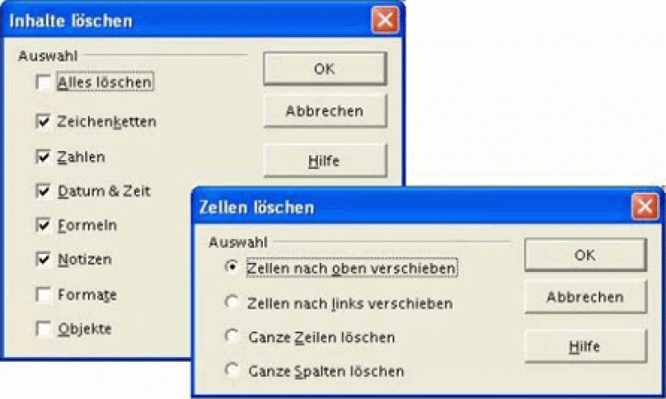 Die Dialogfenster Inhalte löschen und Zellen löschen
