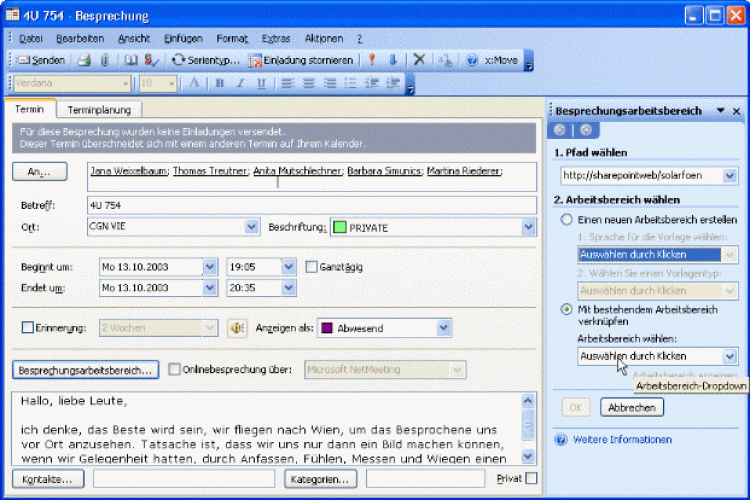 Kehren Sie in das Register Termin zurück und klicken Sie die Schaltfläche Besprechungsarbeitsbereich� Es erscheint ein gleich lautender Arbeitsbereich, in dem Sie den Pfad zum Arbeitsbereich auswählen bzw. eingeben und bestimmen, ob Sie einen neuen Arbeitsbereich errichten wollen bzw. sich mit einem bestehenden Bereich verbinden wollen. Klicken Sie OK.