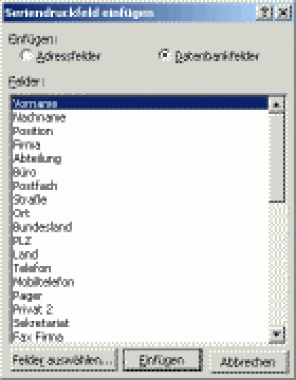 Nutzen Sie daher statt des "Adressblocks" oder der "Grußzeile..." den Befehl "Weitere Elemente" um die Seriendruckfelder (Auswahl: "Datenbankfelder") einzeln einzufügen. An dieser Stelle ist Word nicht besonders eng mit Outlook verwoben: Die Feldzuordnungen sind uneindeutig und die Bezeichnungen weichen leider von denen in Outlook ab.