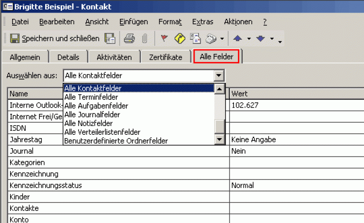 Da in der normalen Kontaktmaske nur eine äußerst begrenzte Zahl von Feldern angezeigt wird, unterschätzen die meisten Outlook-Anwender die Vielfalt der verfügbaren Eintragsmöglichkeiten. Hinter dem Reiter "Alle Felder" verbirgt sich eine Auswahlliste, die den Blick freigibt auf ellenlange Feldlisten. Dort können Sie dann auch ganz genau erkennen, welche Eintragung den einzelnen Feldern zugeordnet ist.