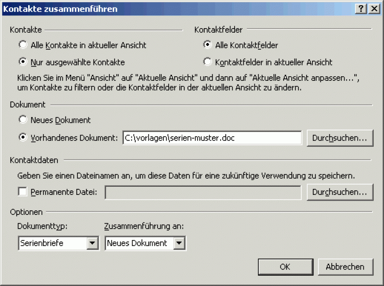 Nun werden Sie natürlich nicht bei jedem (Serien-)Brief die Felder einzeln an die passende Stelle setzen wollen - eine Vorlage muss also her. Wenn Sie Ihren Mischvorgang von Outlook aus starten, können Sie jedoch - untypisch für Office-Anwendungen - nicht mit Dokumentvorlagen (*.dot) arbeiten. Sie müssen statt dessen ein Muster-Dokument (*.doc) für Serienbriefe erstellen.