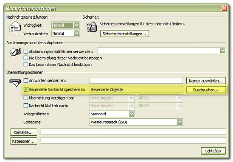 Versandte E-Mails werden in Outlook automatisch im Ordner "Gesendete Objekte" abgelegt. Den Speicherort zu ändern, ist kompliziert und zeitaufwändig. Sie können E-Mails entweder nach dem Versenden manuell in andere Ordner verschieben oder vor dem Versenden den Speicherort bestimmen, indem Sie nach "Ansicht", "Optionen" über die Schaltfläche "Durchsuchen" den jeweiligen Ordner auswählen.