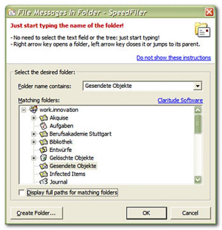 E-Mails sinnvoll abzulegen ist oft umständlich. Claritude Software bietet mit der Erweiterung "SpeedFiler" ein Tool, das Ihnen hilft, Ihre ein- und ausgehenden E-Mails zu organisieren.