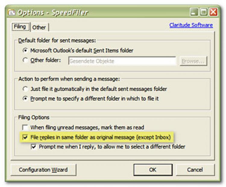 Antworten Sie auf eine E-Mail, die Sie bereits mit SpeedFiler in einen Ordner abgelegt hatten, können Sie den SpeedFiler so einstellen, dass die zu verschickende E-Mail automatisch im gleichen Ordner abgelegt wird.
