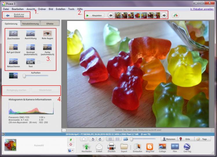 Picasa hat grundsätzlich zwei verschiedene Bearbeitungsfenster, zwischen denen hin- und hergewechselt werden kann.