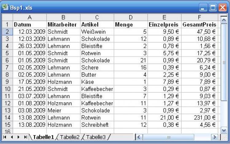 Beispieldatenbestand gem. Arbeitsmappe Bsp1.xls