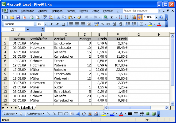 Wie Sie sehen, sind die Daten unsortiert, denn für die Auswertung macht es keinen Unterschied, in welcher Reihenfolge sie stehen. Der GPreis (Gesamtpreis) errechnet sich als Formel aus dem Produkt Menge*EPreis (Einzelpreis).