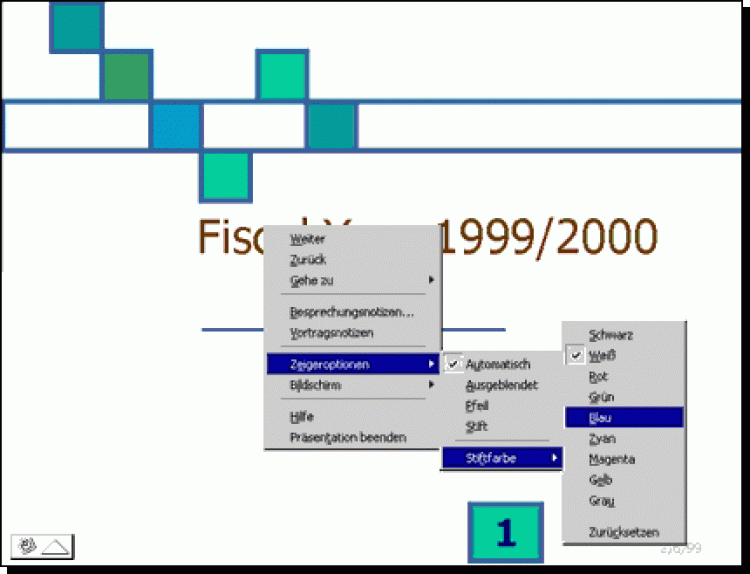 Die rechte Maustaste öffnet während einer Präsentation ein Kontextmenü, in der wichtige Befehle für die Präsentation angeboten werden.