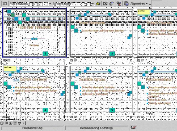 Für ein rasches und effektives Arbeiten in der Foliensortierungsansicht sollten Sie die Formatierung mit dem entsprechenden Symbol ausblenden und mit dem Zoom-Listenfenster der Standard-Symbolleiste eine möglichst kleine Zoomgröße wählen. Um bei angezeigter Formatierung den Titel einer Folie besser lesen zu können, klicken Sie auf die Folie bei gleichzeitig gedrückter ALT-Taste.