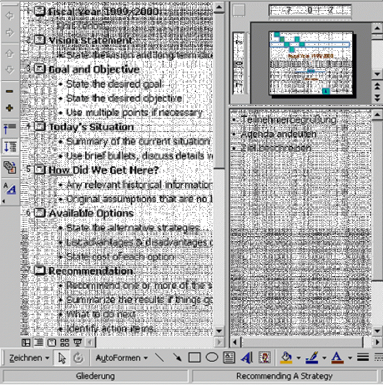 Die Gliederungsansicht ermöglicht, Folien und Texte rasch hinzuzufügen, zu ordnen und Absätze hierarchisch höher oder tiefer zu stufen. Darüber hinaus ist ein Bearbeiten der Rednernotizen auch in dieser Ansicht möglich. Zu beachten ist auch die Miniaturansicht (oben rechts): Sie hilft, die Eingabe von zu viel Text zu vermeiden.
